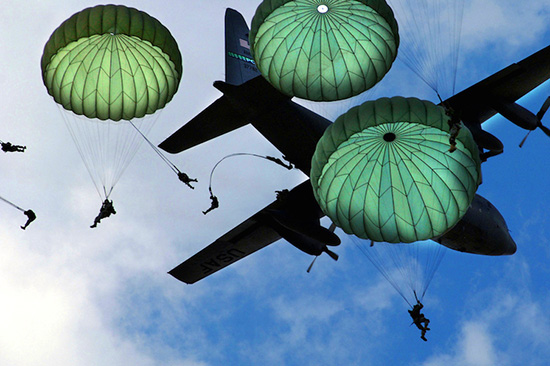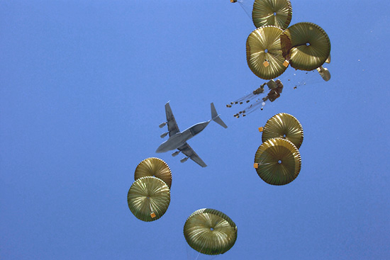 Laser cutters are perfect for mil-spec parachute manufacture. A flatbed laser cutting table guarantees an all-round sealed cut edge, something you cannot get on a conveyor cutter. Inkjet print heads label accurately and quickly with tested, approved ink.